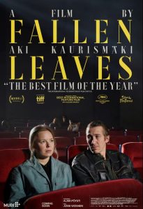 De Finse regisseur Aki Kaurismäki heeft zelf niet zo’n hoge pet op van zijn oeuvre en beschouwt het terugkijken van zijn films als een vorm van masochisme. Misschien is dat omdat hij zichzelf voortdurend herhaalt (Reve: “Wie moet ik anders herhalen?”). Altijd gaat het over mensen die in het leven de slag gemist hebben en wanhopig proberen er nog iets van te maken. Maar als je dat superieur in beeld brengt, is er toch eigenlijk weinig mis met dat herhalen. Fallen Leaves (2023, Finl/DL) gaat over Hollapa, een alchoholische zandstraler in een metaalfabriek, die er flink op los rookt ‘omdat hij toch doodgaat aan stoflongen’. Ondanks dat drinken en roken heeft hij een zekere charme, waar de alleenstaande winkelbediende Ansa wel degelijk oog voor heeft. Heel voorzichtig (want al genoeg geleerd van het leven) proberen ze het met elkaar. Een schuchtere